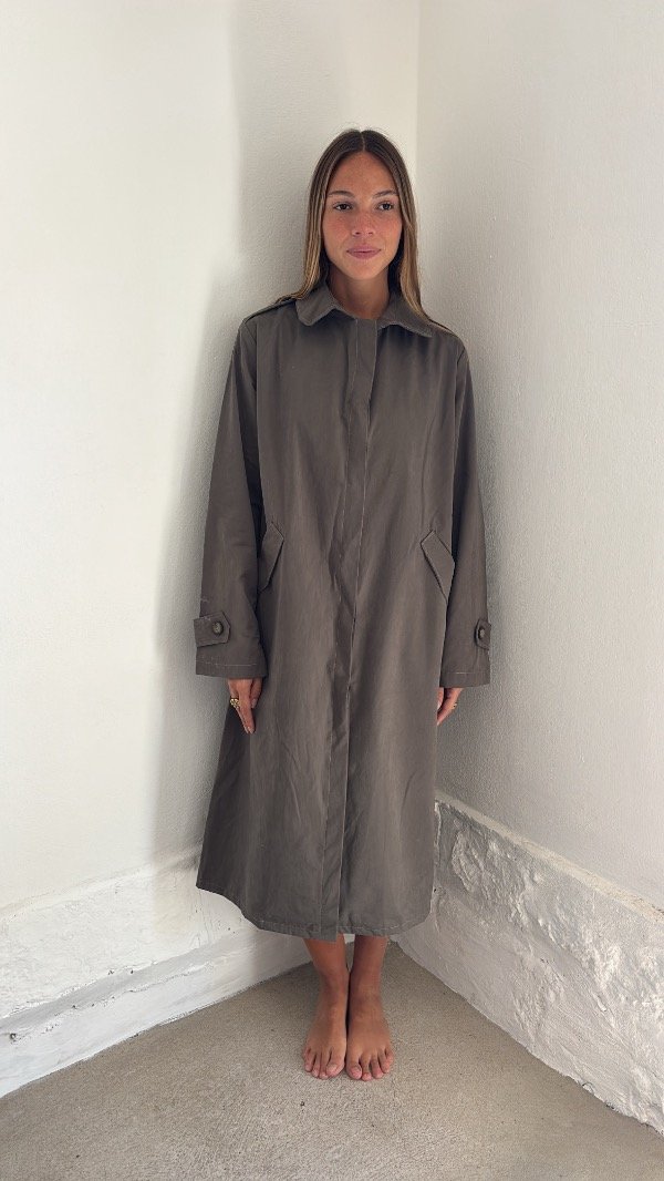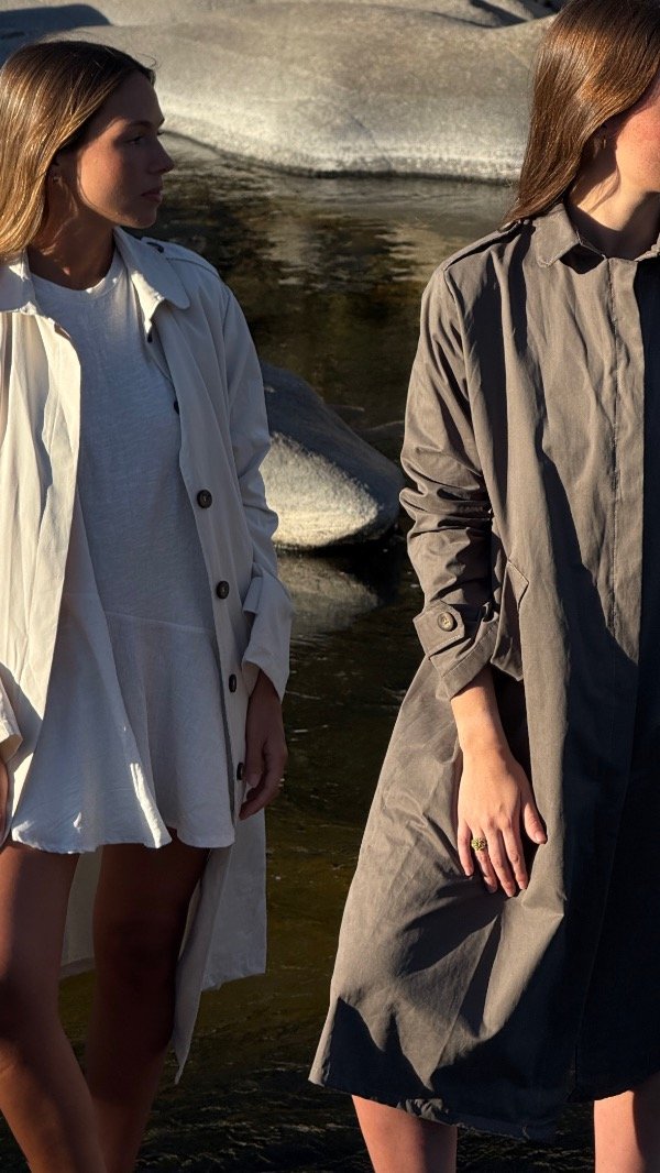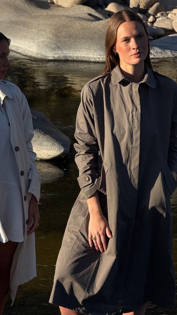 Trench largo con cuello camisero, bolsillos placa laterales y cartera de botones escondidos. Botones de pasta Beteados.