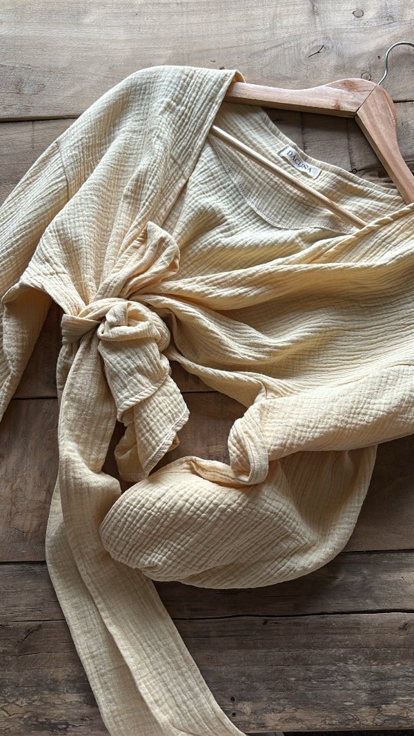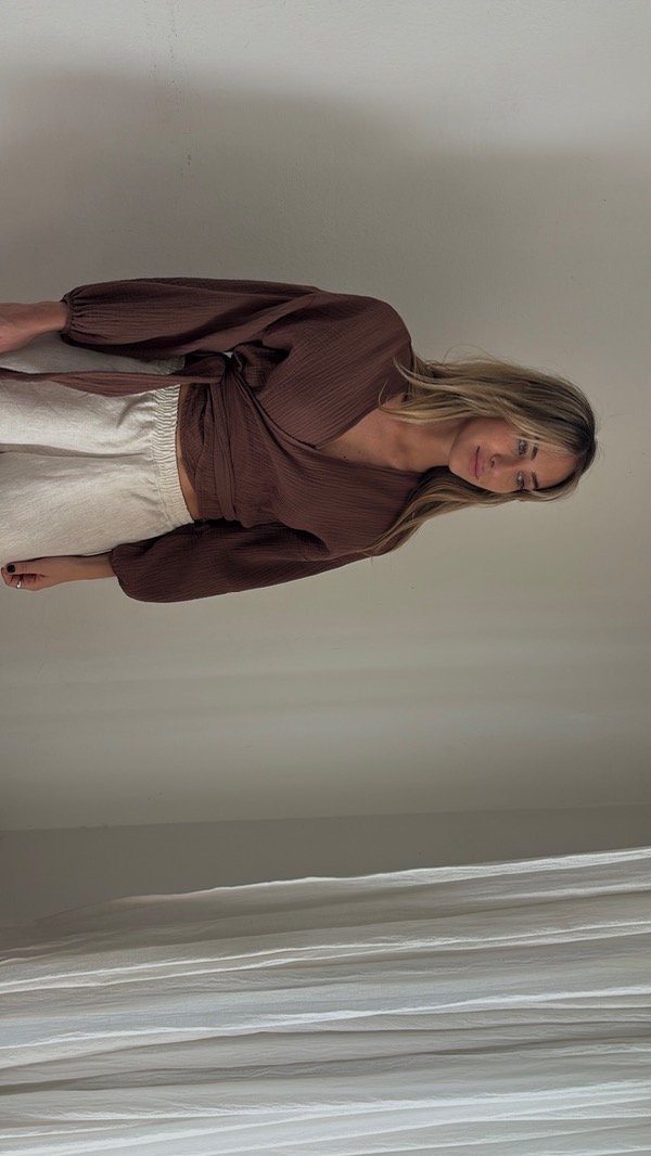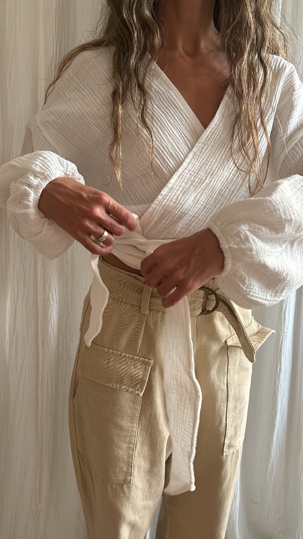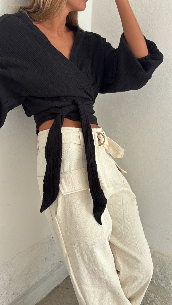 Blusa cruzada con lazo largo, mangas 3/4 con elástico en puños.