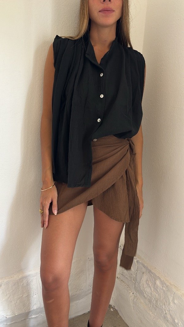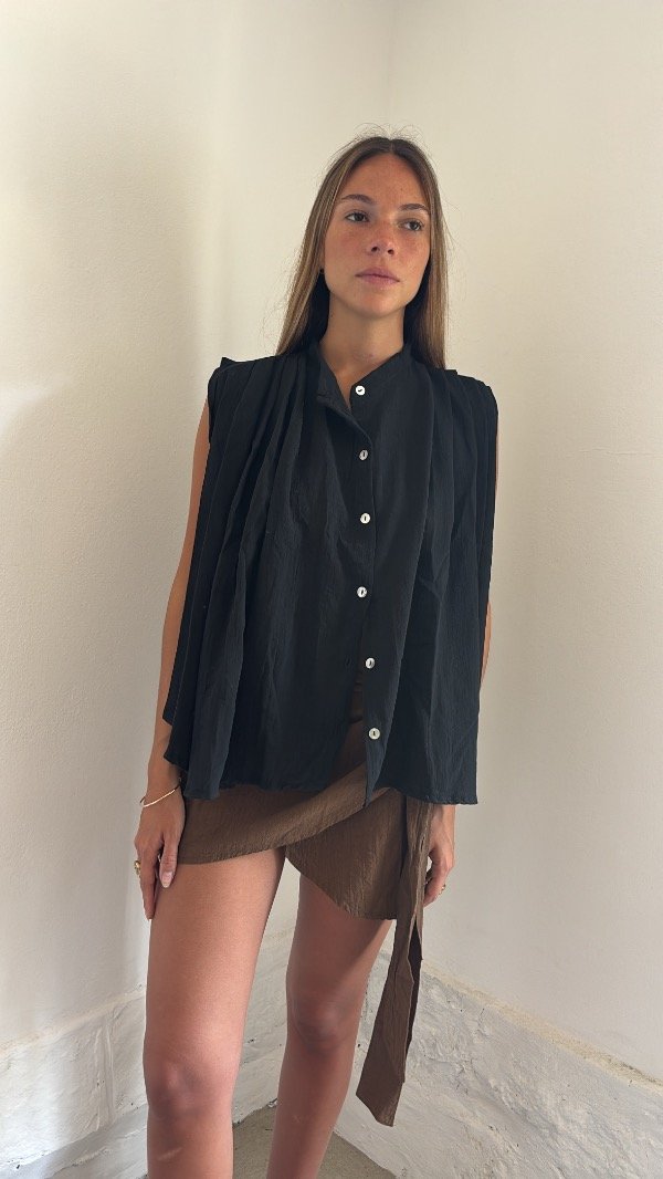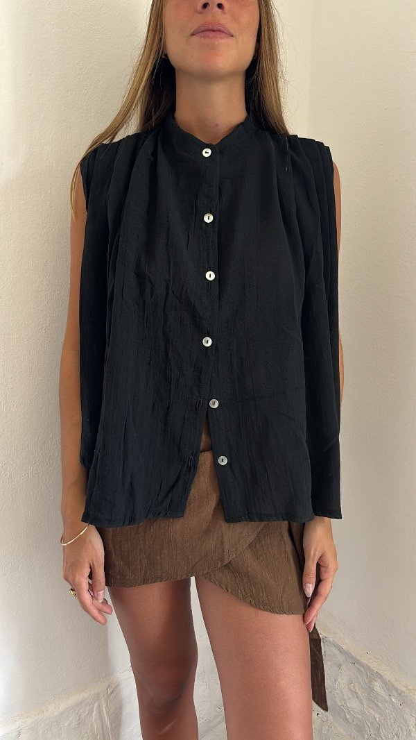 Camisa amplia cuello mao sin mangas, con pinzas en hombros y botoncitos nácar.