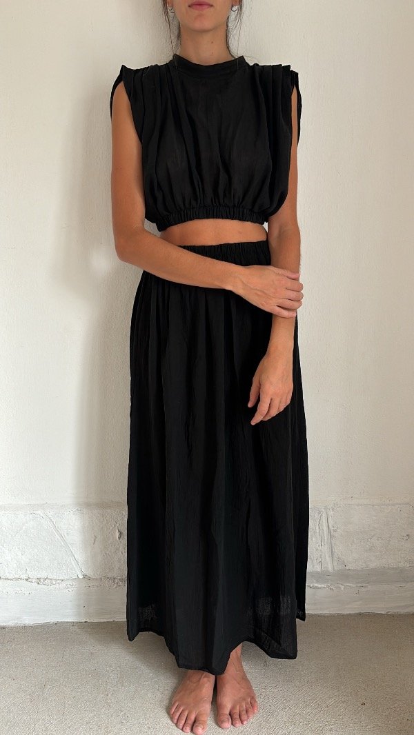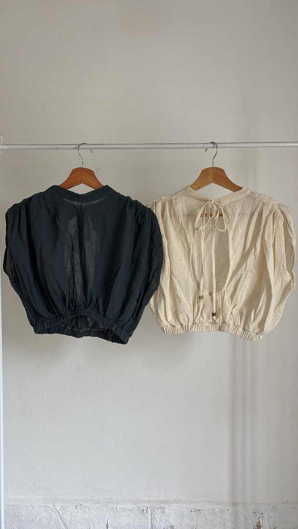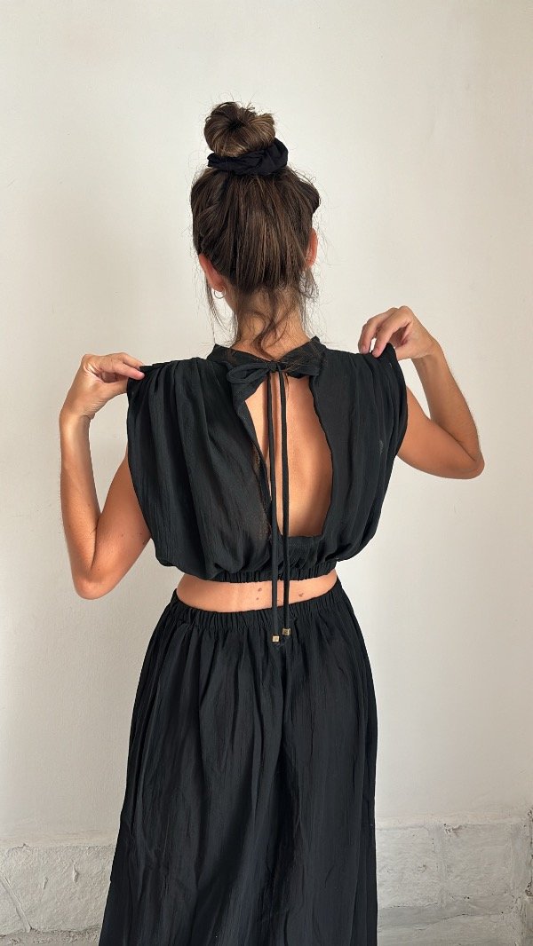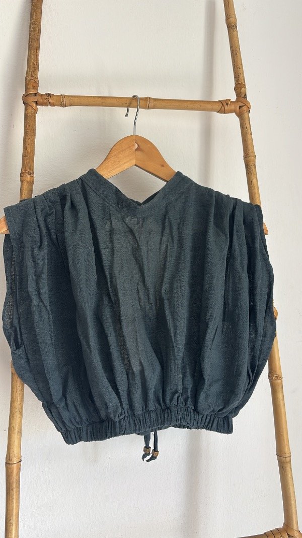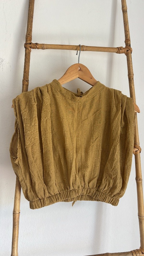 Cintura elastizada, pinzas en hombros, cuello alto con tiras para atar en espalda.