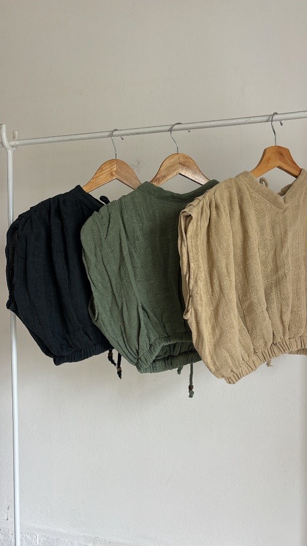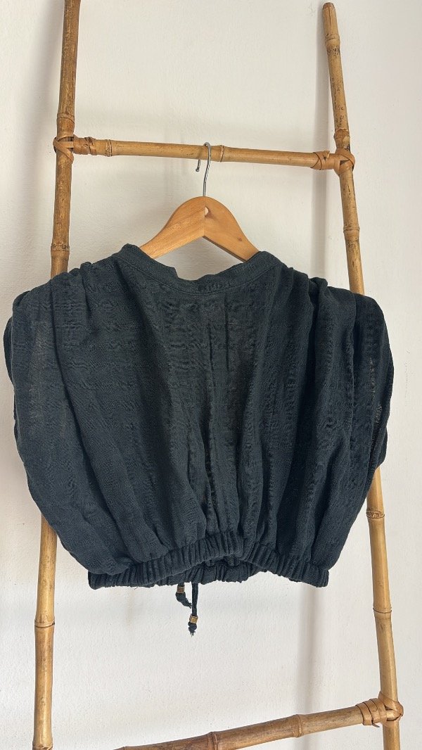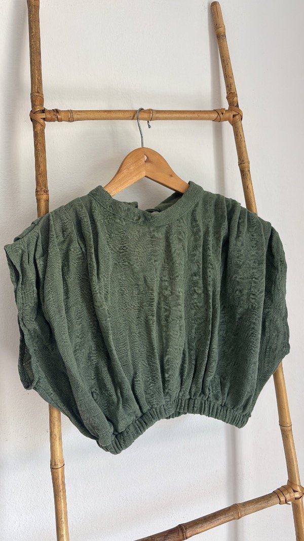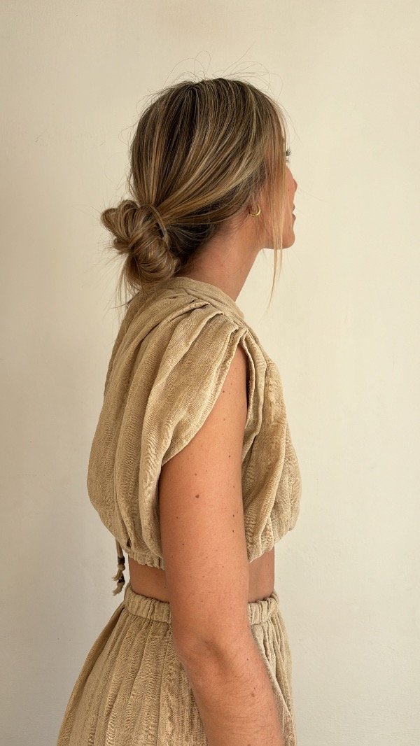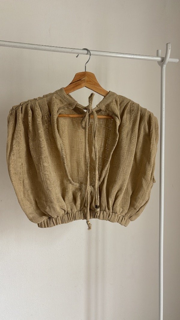 Cintura elastizada, pinzas en hombros, cuello alto con tiras para atar en espalda.