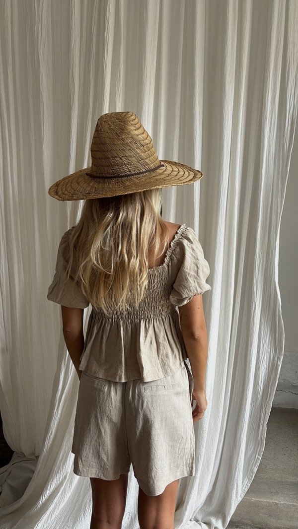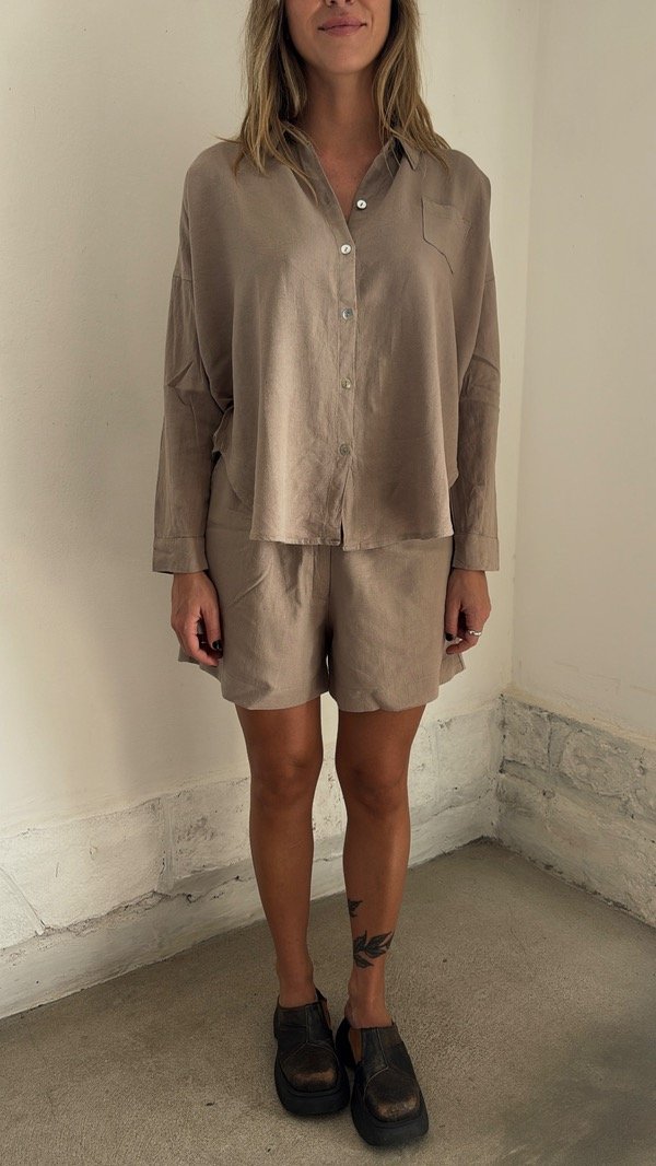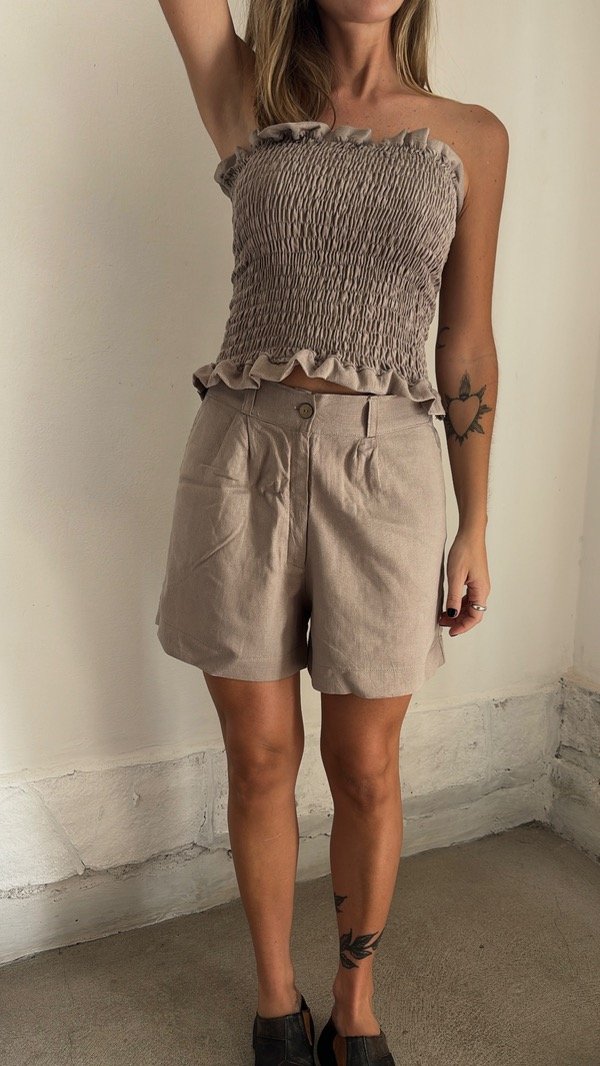 Bermuda de Lino crudo con cierre y botón de coco, pinzas suaves y bolsillos laterales delanteros. Elástico en cintura trasera