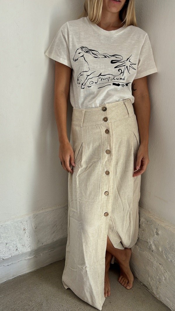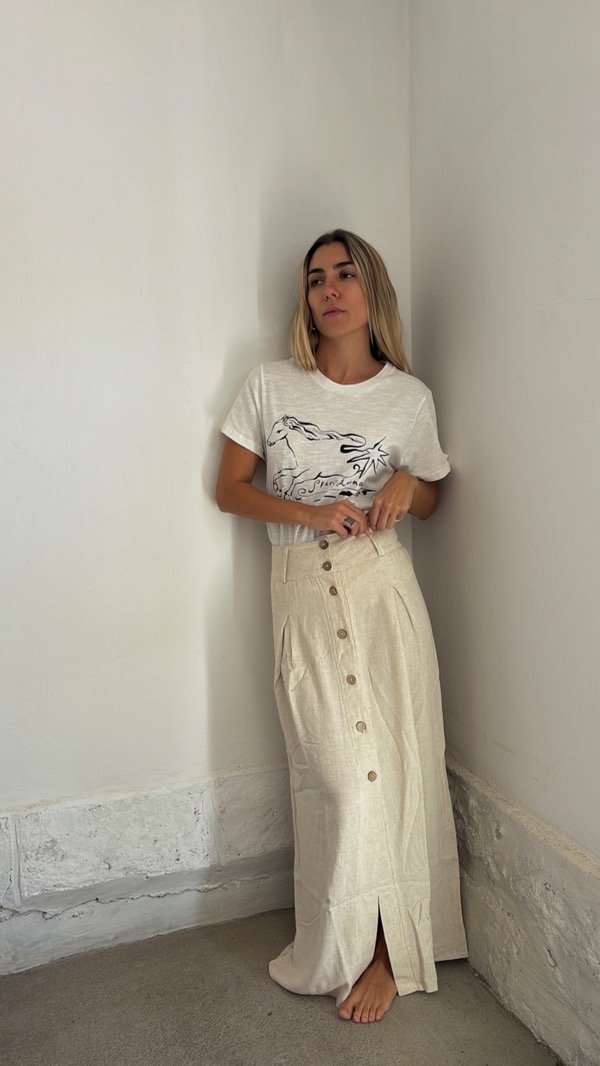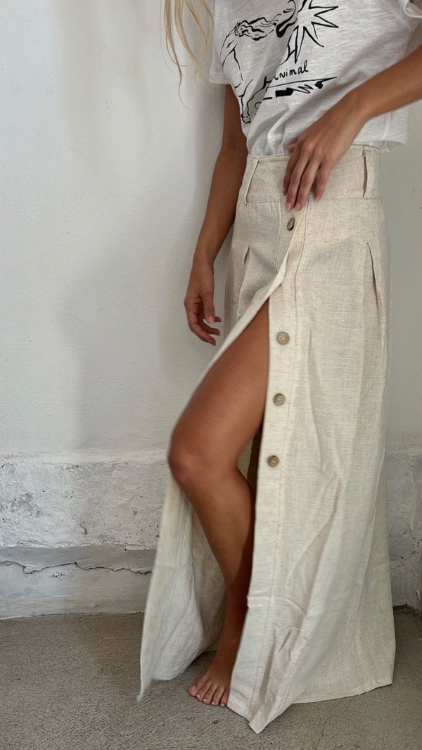 Falda de lino pesado con spandex , pinzas profundas en delantero y trasero, botones de coco