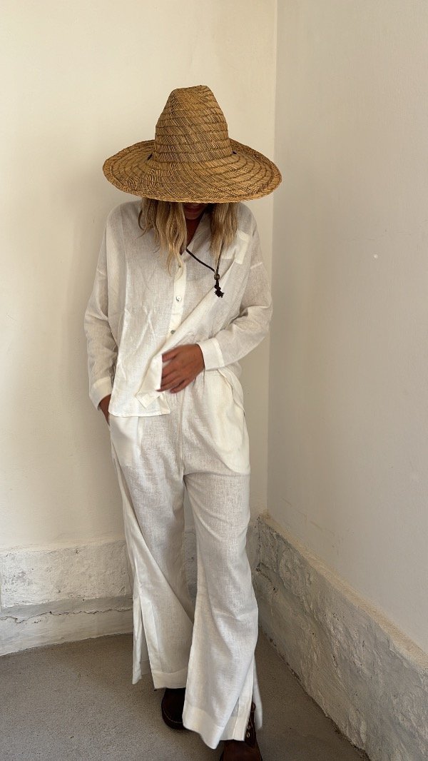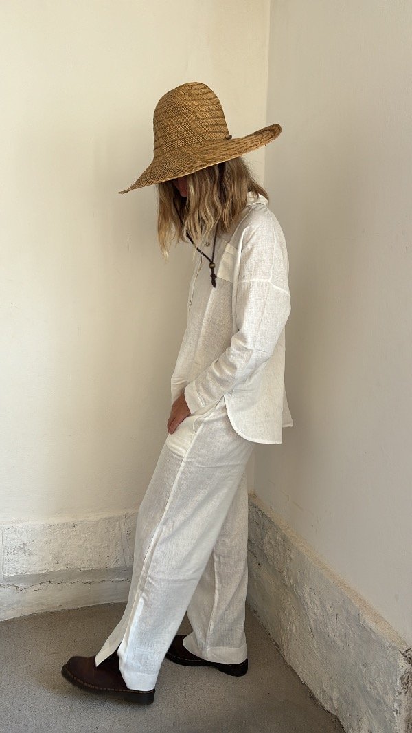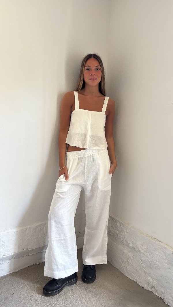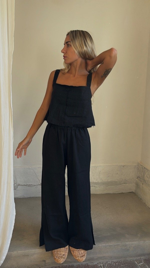 Pantalón ancho, cintura elastizada con tajos laterales en final de pierna y bolsillos laterales delanteros.