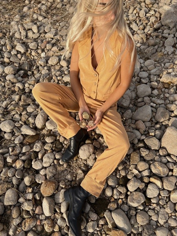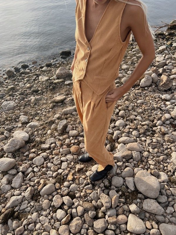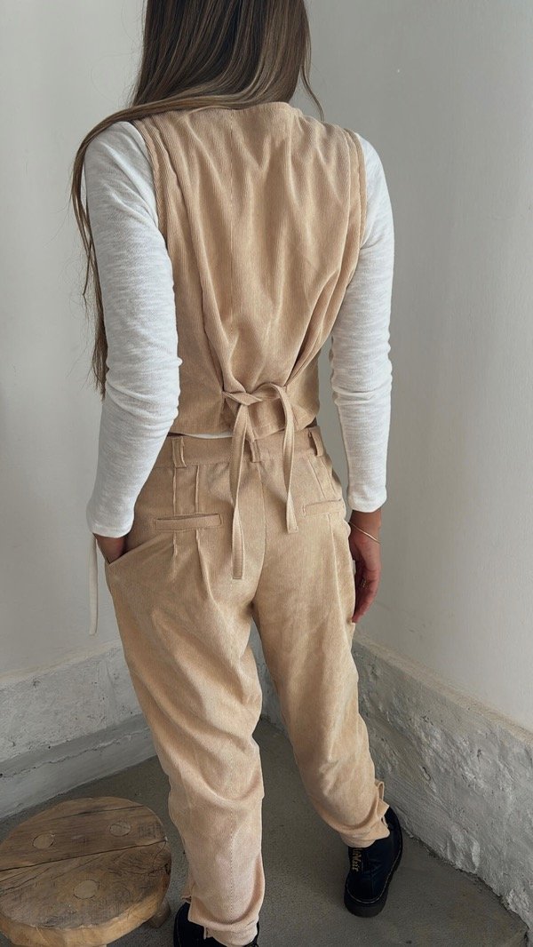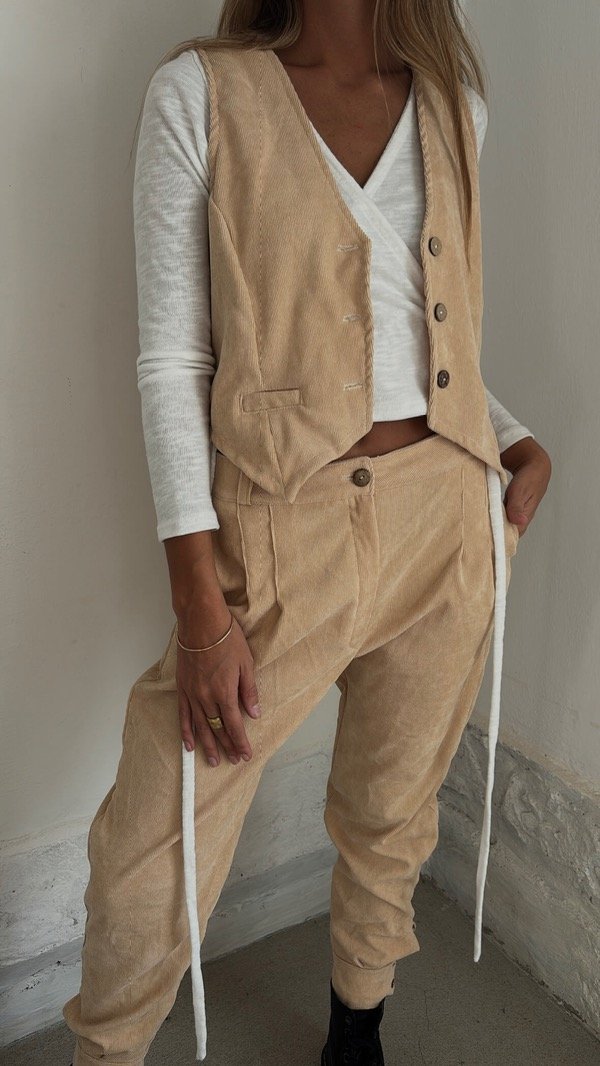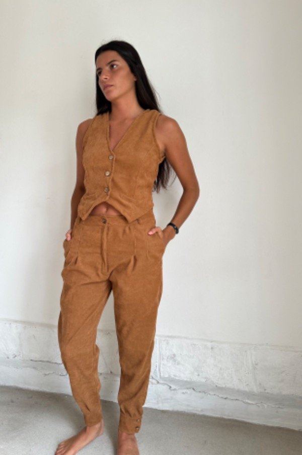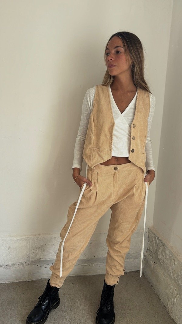 Pantalón tipo bombacha de gaucho. Pinzas profundas delanteras con cierre y botón coco. Vistas bolsillos traseros, bolsillos laterales, doble puño en final de pierna.