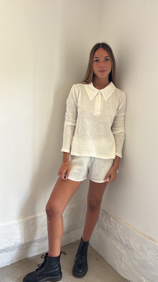 Remera manga larga de algodón, cuello camisero en lino con botones
