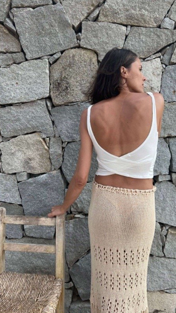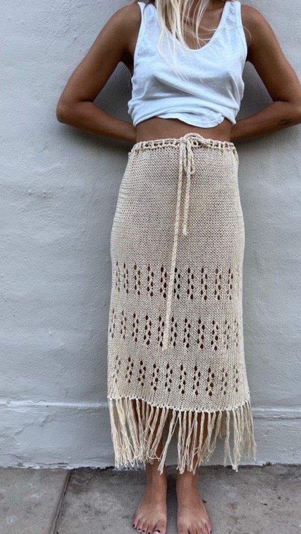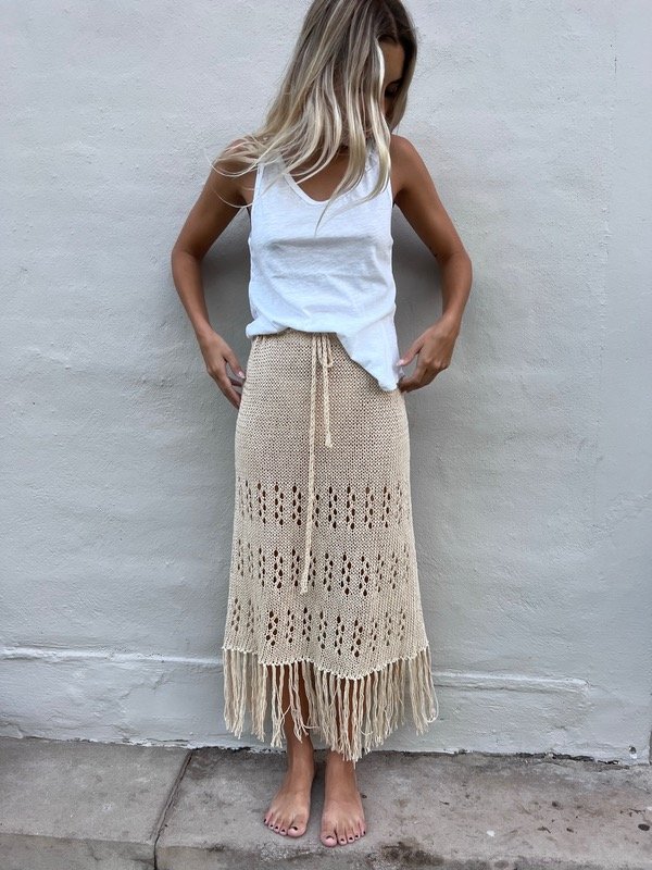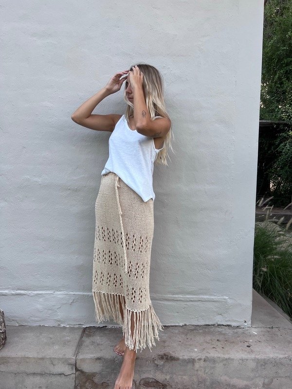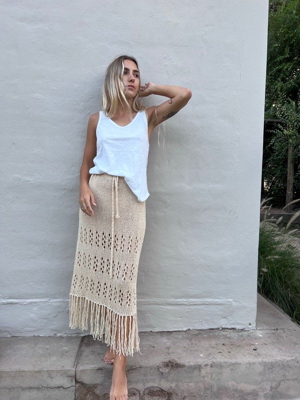 Falda tejida hilo de algodón natural en proceso manual con detalles deshujado y flecos