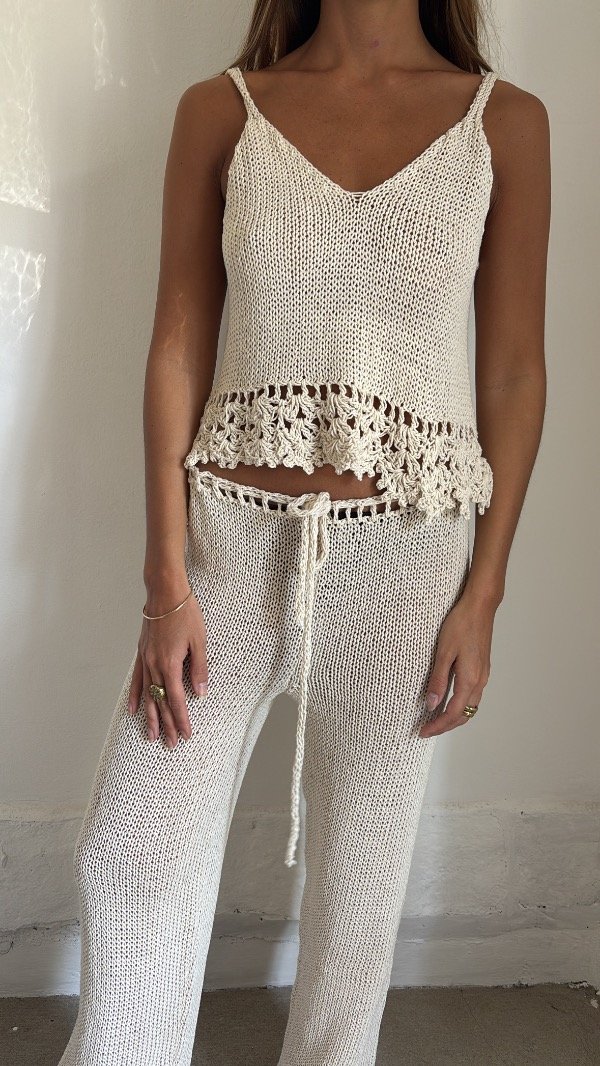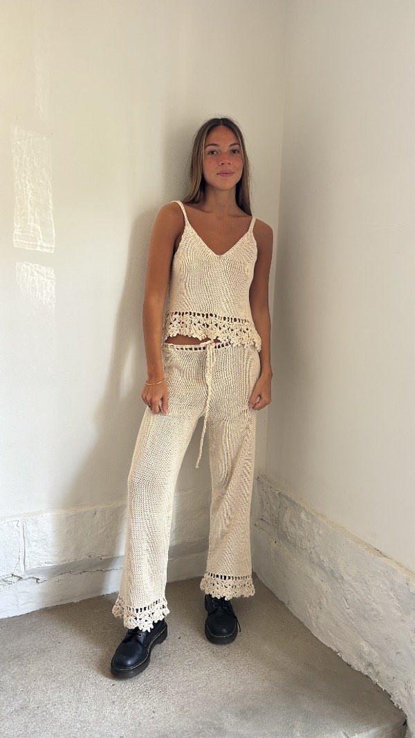 Pantalón tejido en hilo de algodón natural , con detalle al crochet en final de pierna